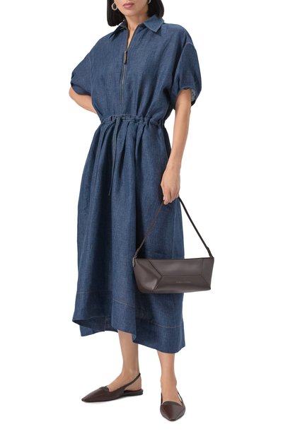 Приталенное миди-платье со складками на пышном подоле и структурированным лифом выполнили из плотной шелковистой ткани. Модель с потайной молнией на спинке дополнили боковыми карманами.