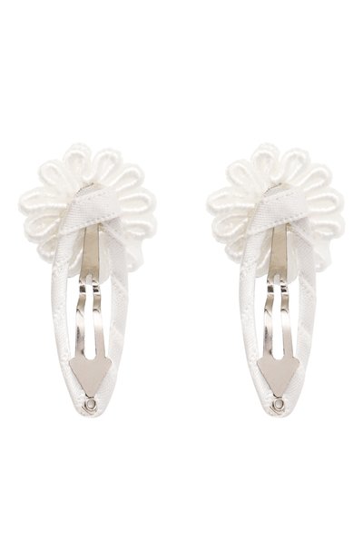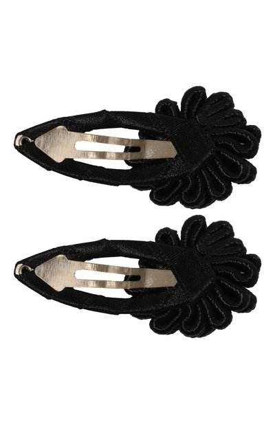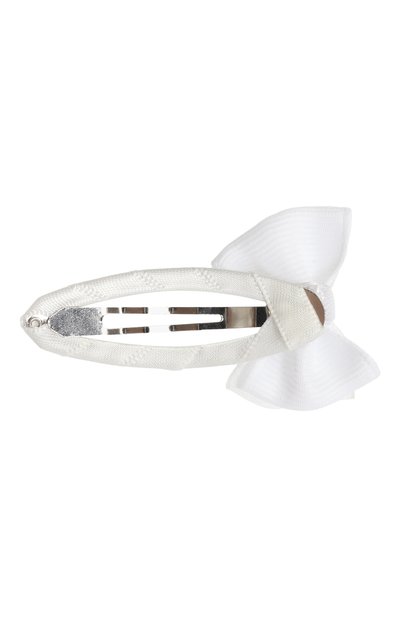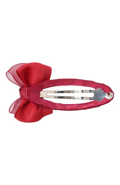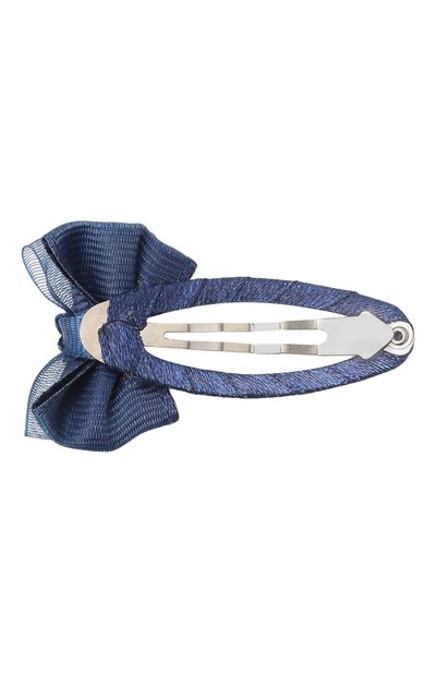 Заколку-клак из гибкого металла обернули узкой атласной лентой. Аксессуар декорировали крупным цветком из сетчатого тюля.