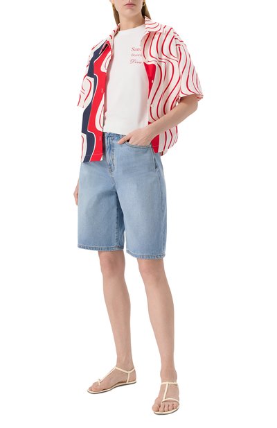 Для пошива футболки Lotte с круглой горловиной и разрезами по бокам использовали хлопковое джерси. Спереди и сзади модель прямого кроя украсили принтом, будто нарисованным от руки.