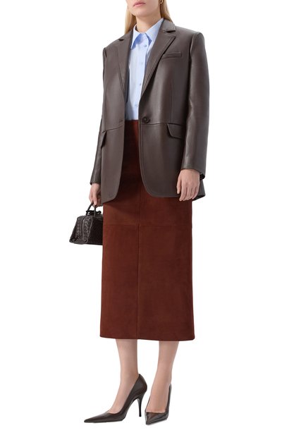 Миди-юбку Solid прямого кроя выполнили из плотной кожи ягненка, покрытой защитным матовым лаком. Модель с разрезом и потайной молнией сзади дополнили подкладом из шелковистой стрейчевой ткани.