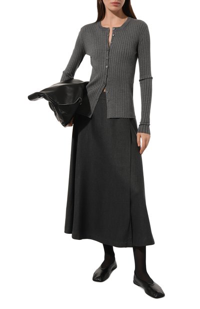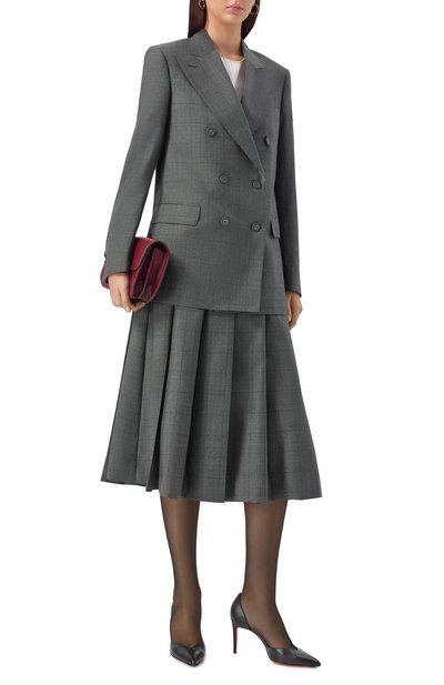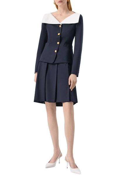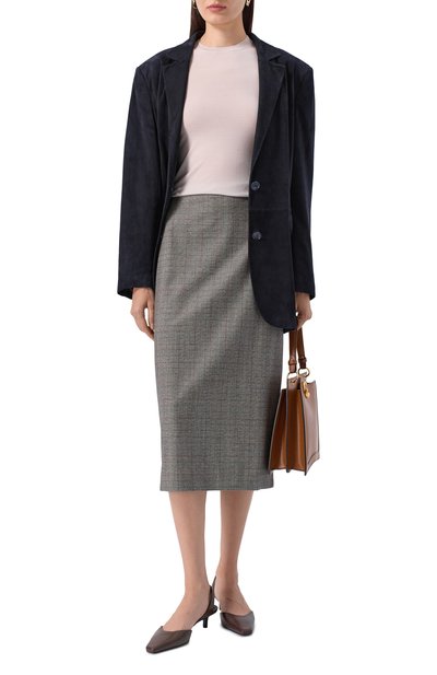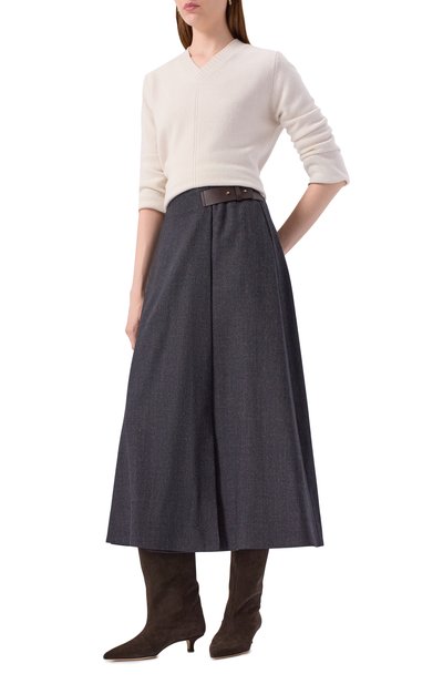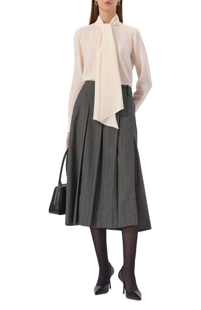 Миди-юбку в широкую складку выполнили из шевронной стрейчевой ткани на основе полиэстера и вискозы. Модель с потайной молнией сбоку и высоким разрезом спереди дополнили карманами в боковых швах.