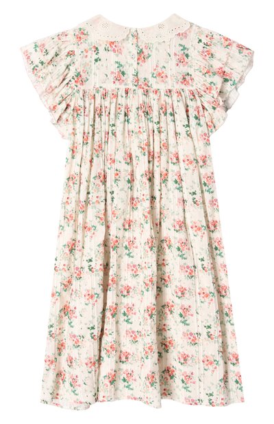 Платье Carolina с гофрированной кокеткой и короткими рукавами-оборками выполнили из тюля с цветочным принтом. Модель на хлопковом подкладе застегивается пуговицей сзади. В комплекте – бархатный пояс-лента.
