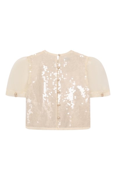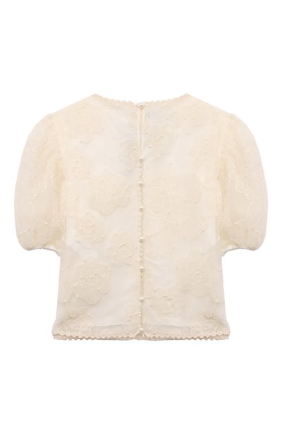 Топ с круглым вырезом и объемными рукавами-буфами сшит из фактурной ткани с цветочными узорами из люрекса. Модель с хлопковым подкладом застегивается потайной молнией сзади.