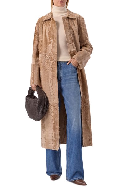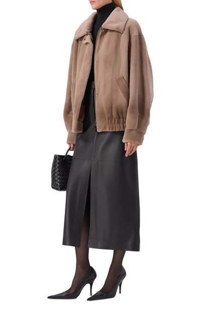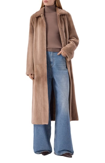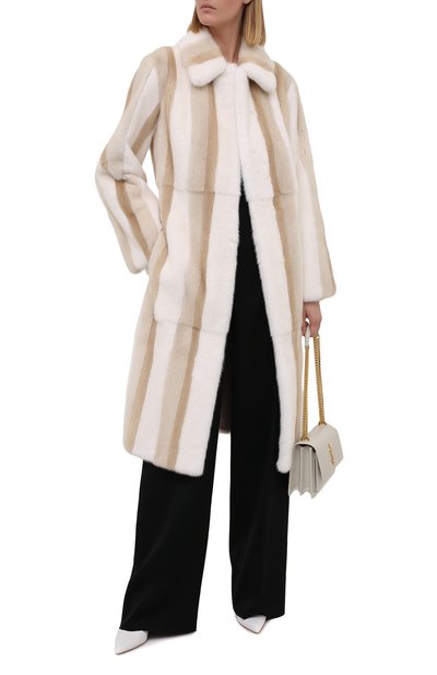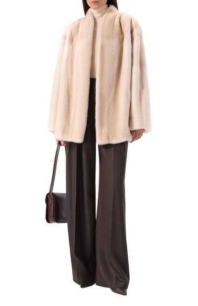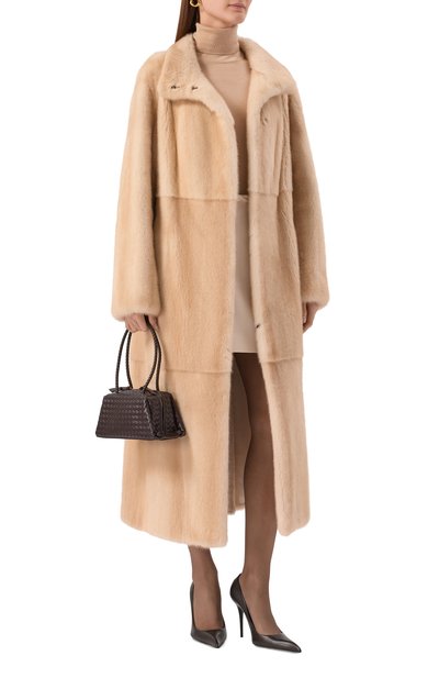 Шубу на атласном подкладе выполнили из меха самок норки «Жемчуг», тщательно отобранного на международном аукционе SagaFurs. Модель с V-образным вырезом и боковыми карманами застегивается потайными крючками.