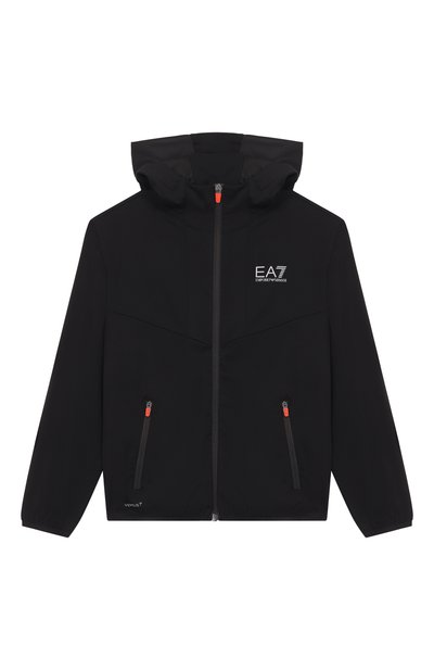 Двухцветную толстовку с капюшоном выполнили из хлопкового трикотажа с добавлением полиэстера. Модель с логотипом на груди и двумя боковыми карманами застегивается молнией.