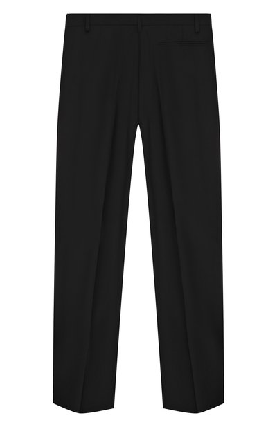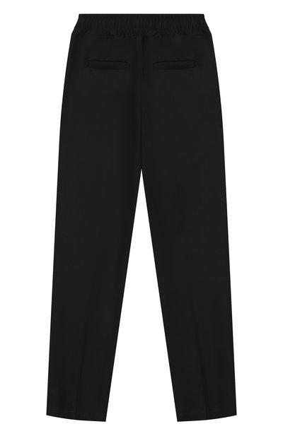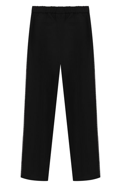 Для пошива брюк с защипами и отворотами использовали стрейчевую ткань из полиэстера и вискозы. Пол поясом спереди модель с боковыми и задними карманами декорировали вставкой с фирменным триколором.