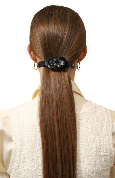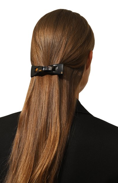 Заколку для волос с металлическим зажимом украсили бантом из материала с графичным узором. Принадлежность модели марке обозначили фирменной миниатюрной накладкой-эмблемой.