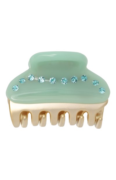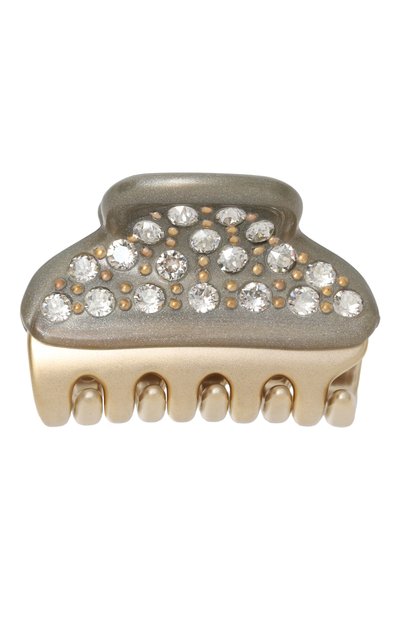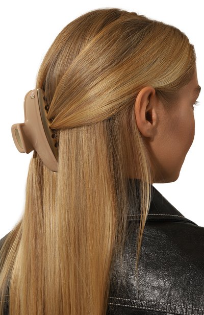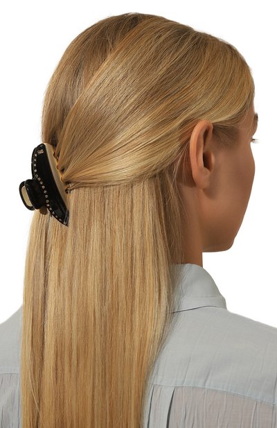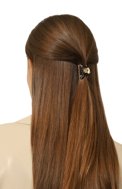 Заколку для волос выполнили вручную из глянцевого ацетата. Аксессуар с упругой пружиной и закругленными золотистыми зубцами украсили миниатюрной эмблемой марки.