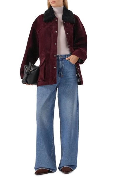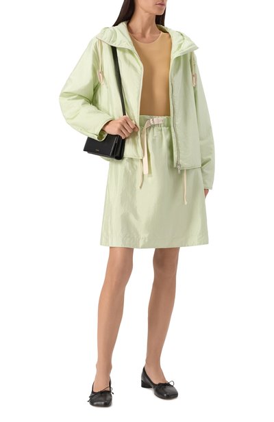 Стеганый жакет с объемными рукавами-буфами выполнили из эластичного шелка с авторским принтом, сочетающим геометричные и цветочные мотивы. Утепленную модель дополнили поясом-лентой из такой же ткани.