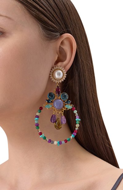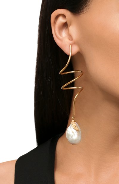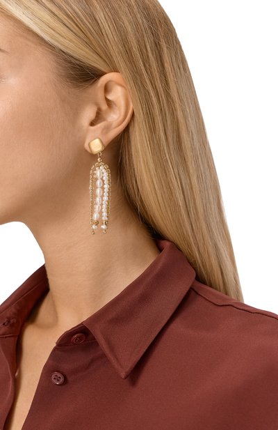 Серьги с брендированным кубом на застежке и кольчужной подвеской изготовили из латуни gold filled. Основание модели дополнили натуральной жемчужиной и вставкой в форме диска.