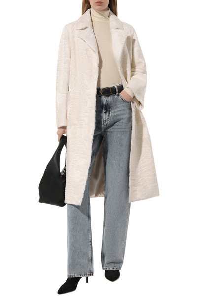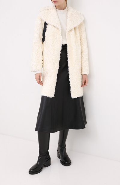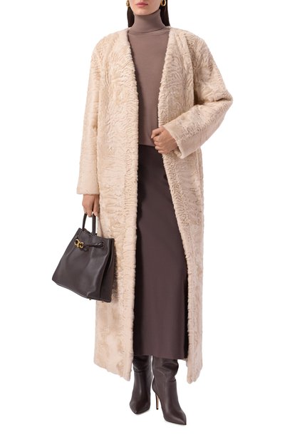 Шубу с прямоугольными лацканами, которые можно застегнуть наглухо, дополнили боковыми карманами. Модель с высокой шлицей сзади изготовили из выделанного вручную меха норки.