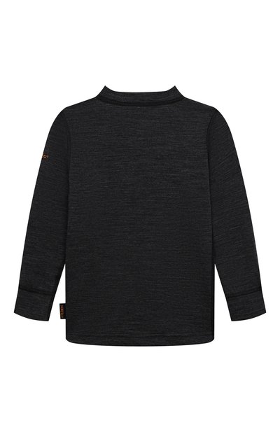Для изготовления лонгслива использовали двухслойный трикотаж из мериносовой шерсти и термолайта. Модель с влаго- и терморегулирующими свойствами декорировали вышитым логотипом на рукаве.
