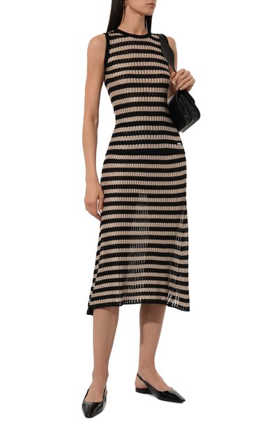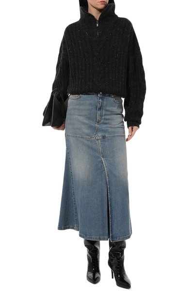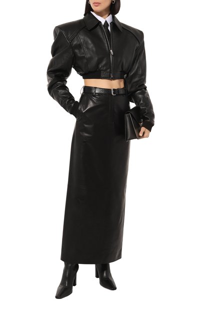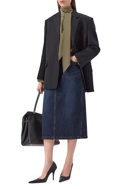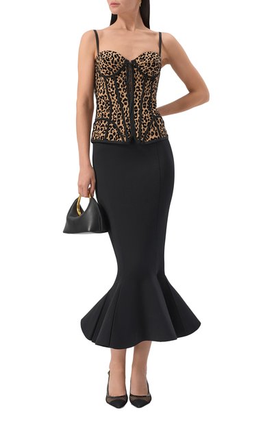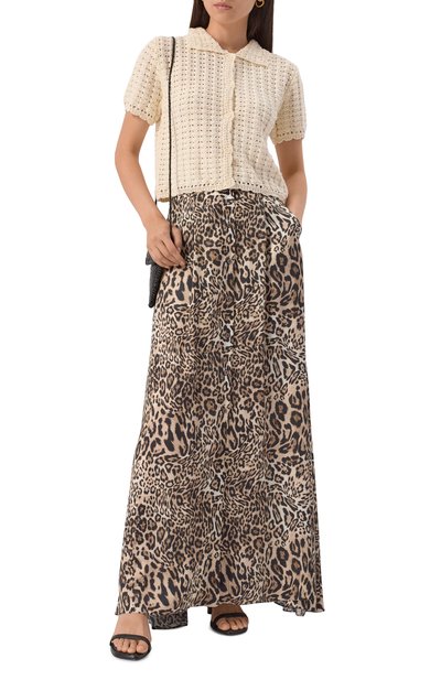Миди-юбка с высокой шлицей сшита из матового шелка с леопардовым принтом. Модель, застегивающаяся сзади потайной молнией, составит гармоничный дуэт с парным жакетом.