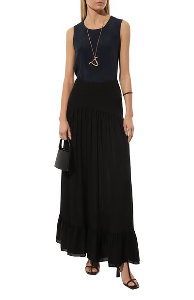 Топ прямого кроя сшит из струящегося шелкового атласа. Модель с круглой горловиной, застегивающуюся пуговицей сзади, оставили без декора.