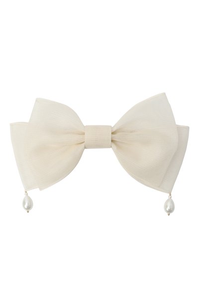 Бант «Балерина» с металлической заколкой-автоматом выполнили из шелка. Края двойного аксессуара украсили подвесками из каплевидных перламутровых бусин.