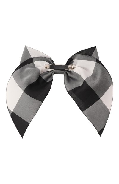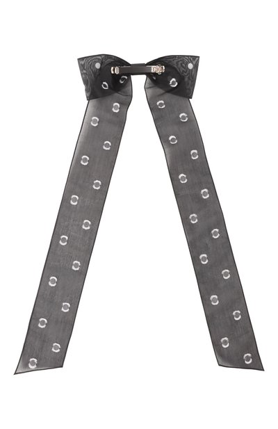Прямоугольный бант с удлиненными ниспадающими лентами выполнили из шелка. Модель крепится к волосам с помощью металлической заколки.
