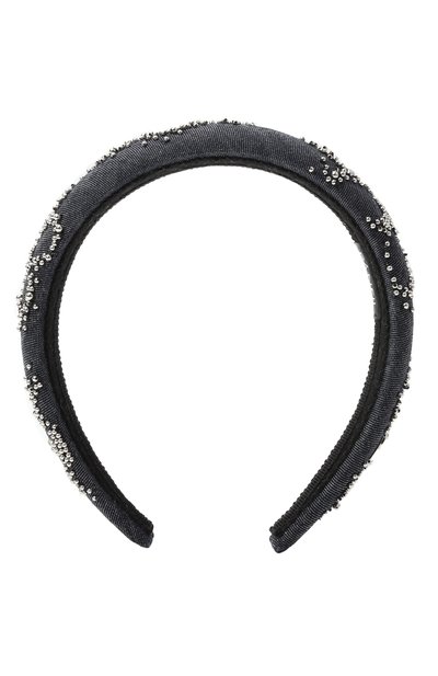 Широкий ободок с репсовой лентой на внутренней стороне изготовили из денима. Модель с фирменной брендированной пластиной украсили цветочной вышивкой бусинами.