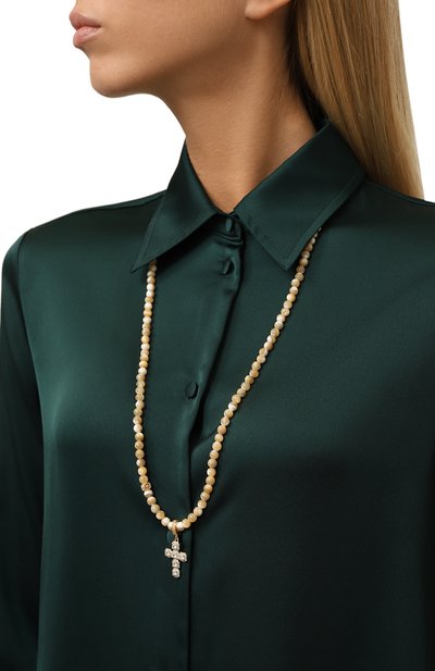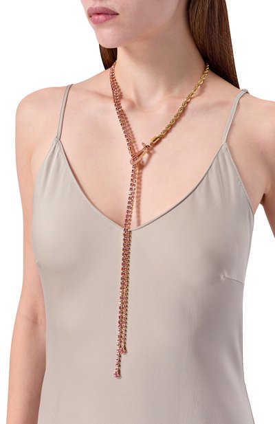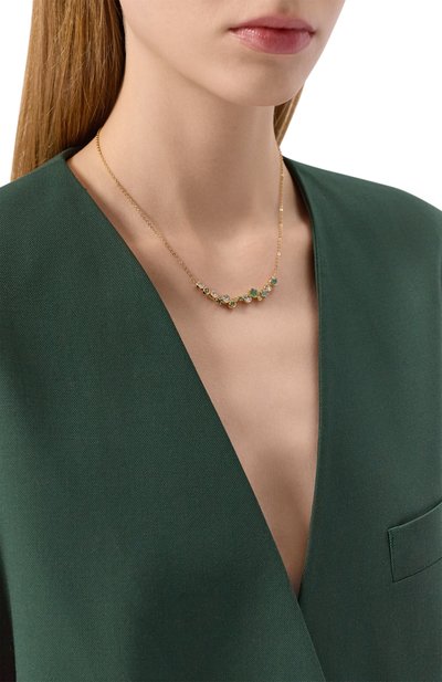 Колье из латуни покрыли тонким слоем 14-каратного золота. Изделие с витой цепочкой и крупным карабином инкрустировали изумрудными кристаллами.