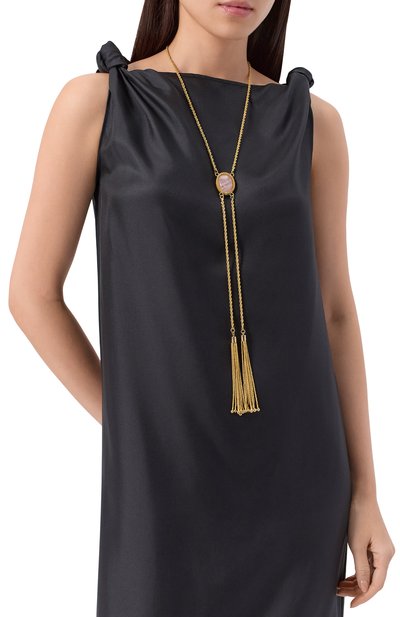 Длинное колье-сотуар с вставкой из витой цепочки выполнили из латуни с покрытием желтым 14-каратным золотом. Аксессуар с крупным карабином инкрустировали кристаллами разных размеров.