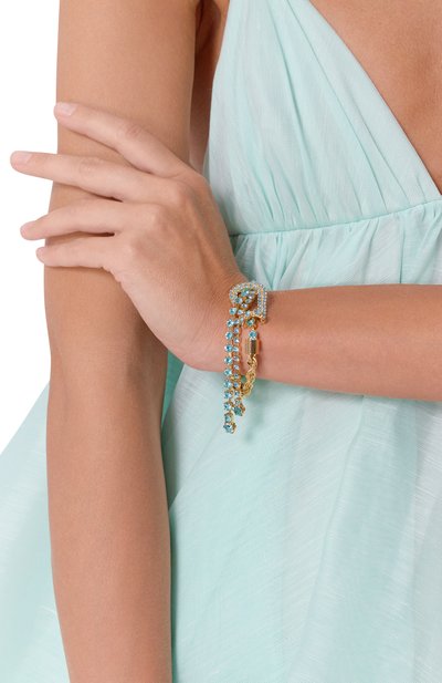 Для изготовления браслета с крупным карабином использовали полированную латунь с покрытием желтым золотом 585-й пробы. Аксессуар со свободно ниспадающими концами и вставкой из витой цепочки декорировали кристаллами драгоценной огранки.