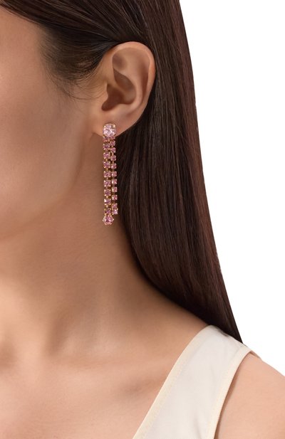 Серьги с застежкой-петлей изготовили вручную из латуни, покрытой золотом 585-й пробы. Длинную цилиндрическую подвеску дополнили граненым розовым кварцем.