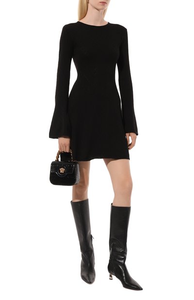 Платье Black Arachne выполнили из шелкового атласа с добавлением эластана, а для отделки использовали цветочное кружево в тон. Модель украсили асимметричными разрезами, дополненными множеством узких бантов.