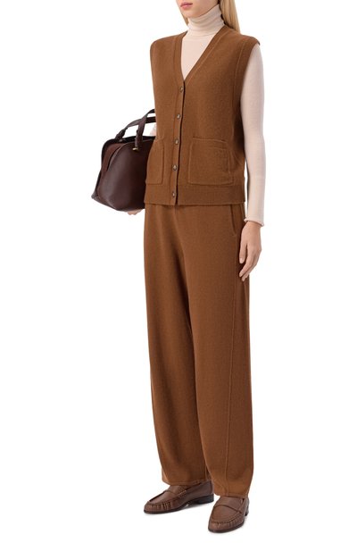 Жилет с рельефными арановыми узорами и отделкой в рубчик выполнили из полушерстяной пряжи. Глубокий V-образный вырез украсили фестончатым кружевом с цветочным мотивом.