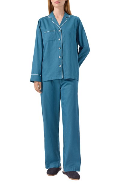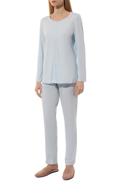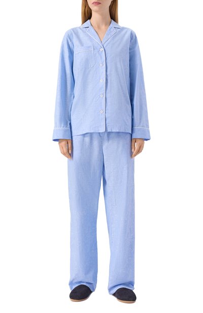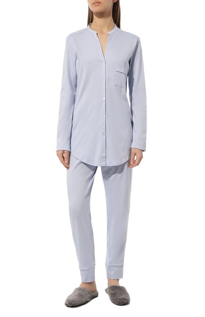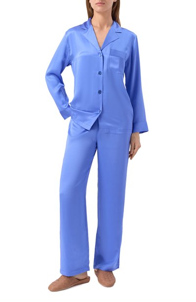 Пижаму выполнили из стрейчевого тонкого трикотажа на основе хлопка и модала. Рубашку с укороченной планкой дополнили встречной складкой на спинке, а брюки – эластичным поясом.