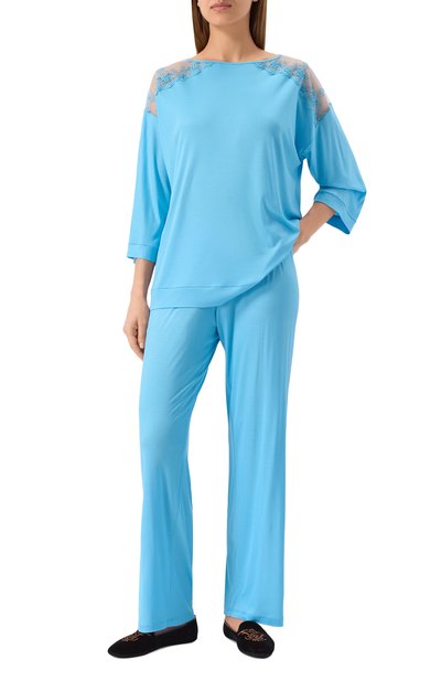 Пижаму выполнили из стрейчевого тонкого трикотаж а на основе хлопка и модала. Рубашку с укороченной планкой дополнили встречной складкой на спинке, а брюки – эластичным поясом.