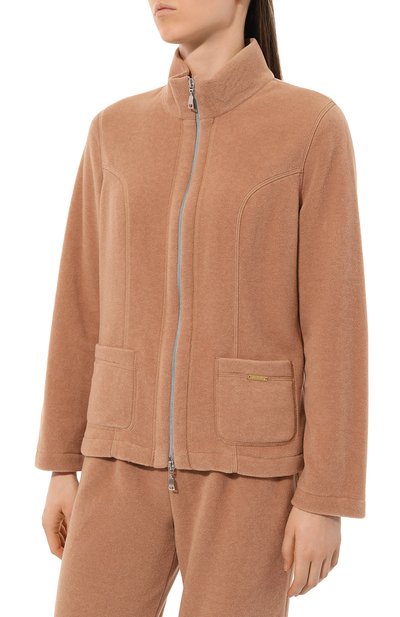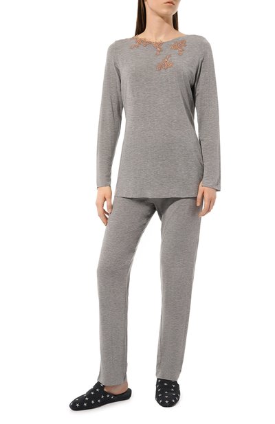 Меланжевую пижаму свободного кроя сшили из эластичного модала. Лонгслив с рукавами реглан и ажурной эмблемой марки дополнили широкими брюками с эластичным поясом.