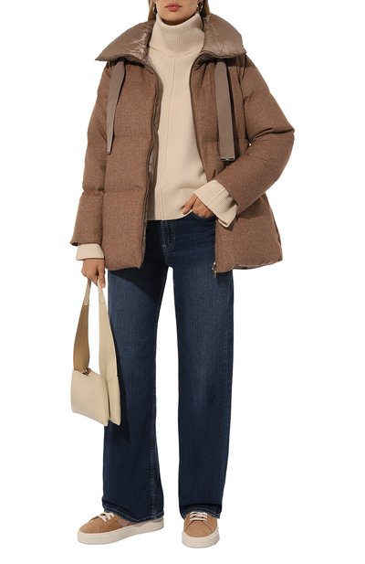 Oversize-свитер с круглой горловиной, поясом и манжетами в рубчик связали из кашемировой пряжи в четыре нити. Модель может стать основой комфортного повседневного образа.
