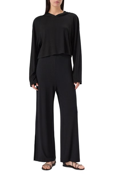 Для пошива брюк прямого кроя использовали трикотаж из шерсти мериноса и хлопка. Эластичную модель со средней посадкой дополнили двумя врезными карманами и поясом-кулиской.