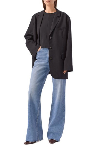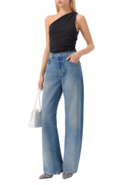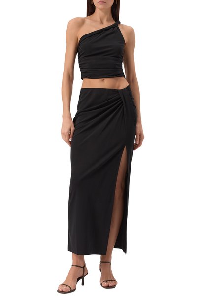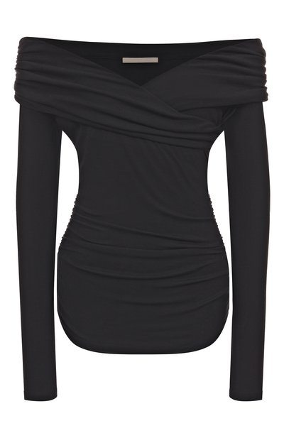 Облегающий топ в мелкую складку выполнили из вискозного трикотажа с добавлением шерсти и эластана. Открытую линию плеч подчеркнули широкой драпированной накладкой.