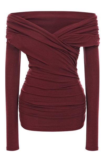 Топ с открытой линией плеч выполнили из стрейчевого вискозного трикотажа с добавлением шерсти. Драпированная модель гармонично впишется в базовый гардероб.
