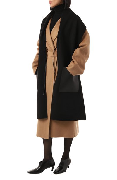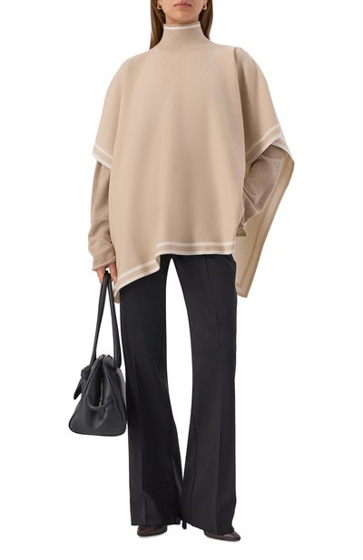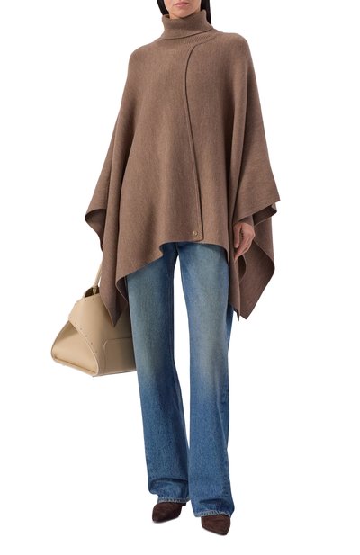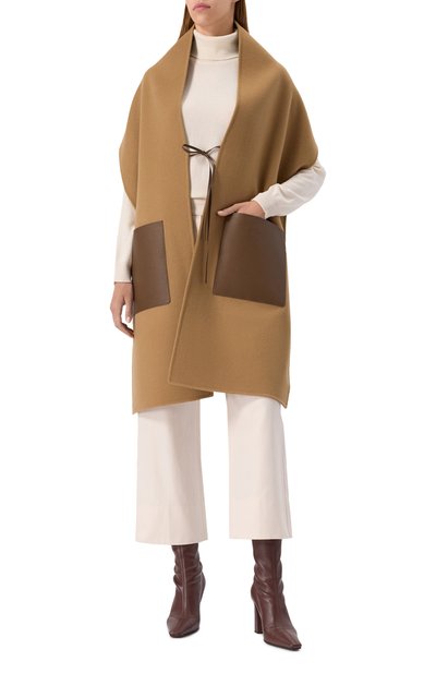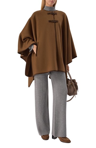Кейп с круглой горловиной и боковыми карманами выполнили из шерсти мериноса. Модель из капсульной коллекции GI дополнили отделкой и парой ремешков с кобурными пряжками, изготовленными из кожи.