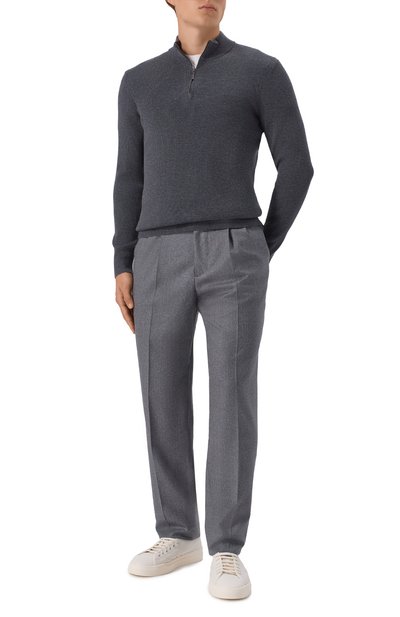 Меланжевый джемпер с воротником-стойкой выполнили из шерсти мериноса в рубчик. Эластичная модель на молнии легко впишется в образ smart casual.