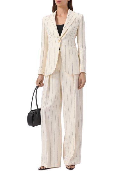 Пуловер с отложным воротником, манжетами и поясом в рубчик выполнили из шелкового трикотажа с добавлением кашемира. С узкими полосками, выполненными ламинированной нитью, зарифмовали декоративные пуговицы с рельефным логотипом спереди.