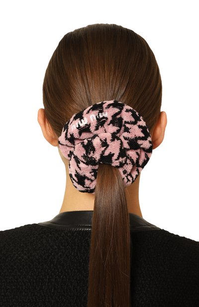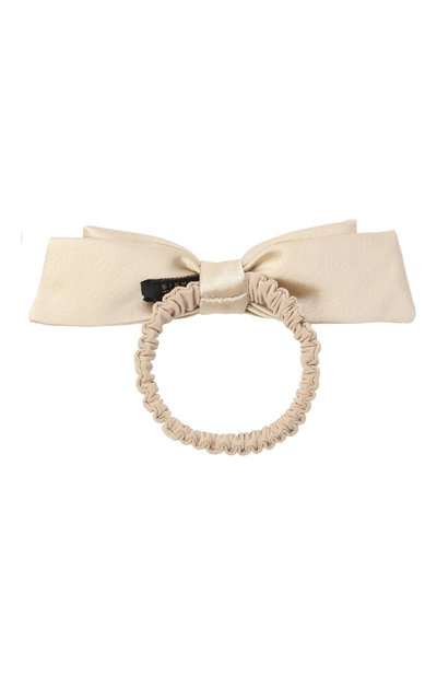 Резинку для волос изготовили из текстиля. Модель украсили объемной розой, подчеркнув ее лепестки бусинами в тон. Деталь в форме листка дополнили фирменной брендированной пластиной.