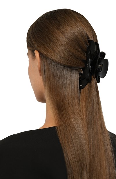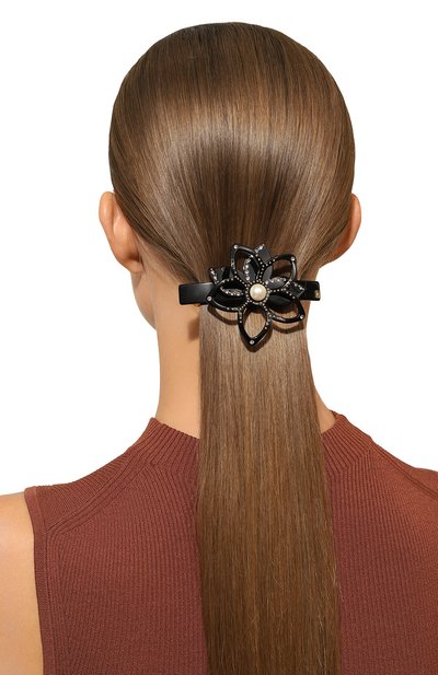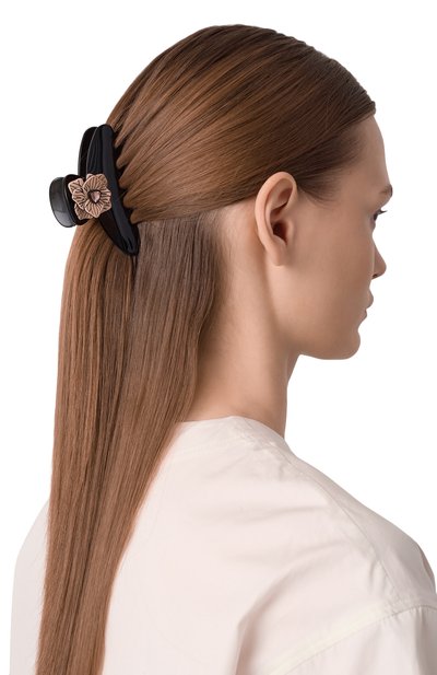 Заколку-бант с зажимом, обтянутым силиконовым чехлом, выполнили из текстиля. Аксессуар украсили цветочным мотивом, вышитым гранеными бусинами.