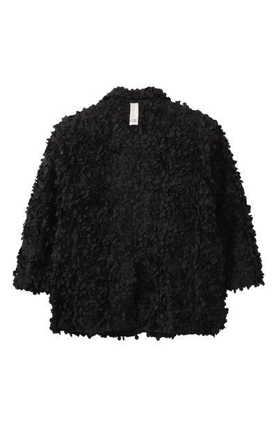 Жакет с круглой горловиной, украшенной фирменной накладкой сзади, выполнили из твида с добавлением хлопка, шерсти и люрекса. Модель застегивается крупными пуговицами в тон.