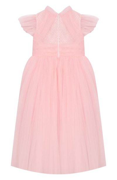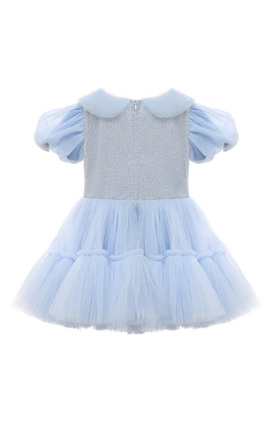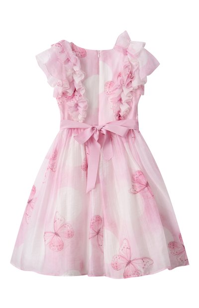 Платье на хлопковом подкладе выполнили из полиэстеровой сетки с цветочным принтом. Модель с оборками на плечах и подоле застегивается потайной молнией на спинке. Изделие дополнили контрастным атласным поясом с бантом и крупным кристаллом.