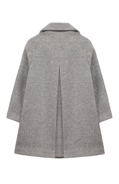 Двубортное пальто с накладными карманами по бокам изготовили из фактурной ткани на основе полиэстера. Из такого же материала выполнили аппликацию в форме цветка на круглом воротнике. Левый рукав модели украсили брендированной пластиной.