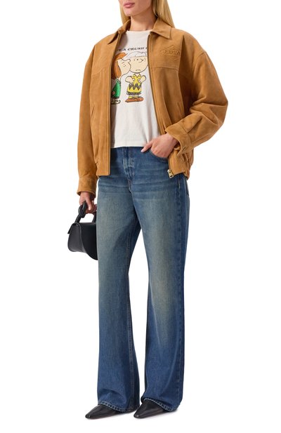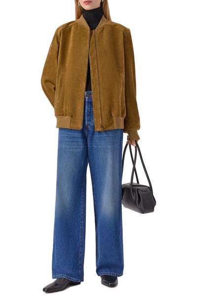 Бомбер с отложным воротником, спущенной линией плеч и двумя врезными карманами сшили из замши. Куртка с эластичным поясом, манжетами на кнопках и атласным подкладом застегивается молнией.