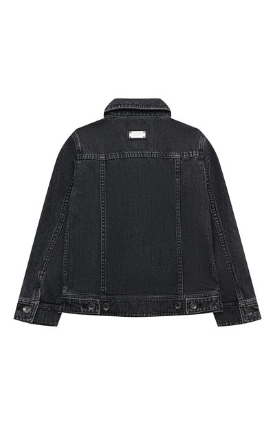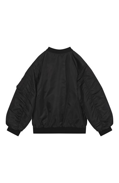 Куртку-рубашку на молнии выполнили из стрейчевого трикотажа на основе хлопка и модала. На спинке модель с погонами и двумя парами накладных карманов на кнопках декорировали патчами с надписями.