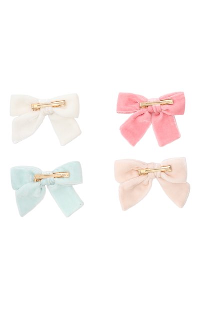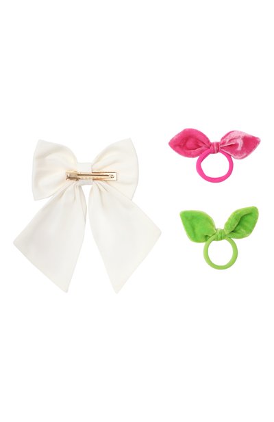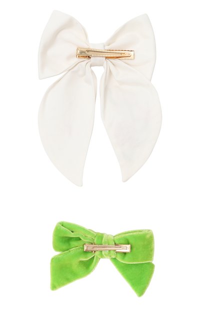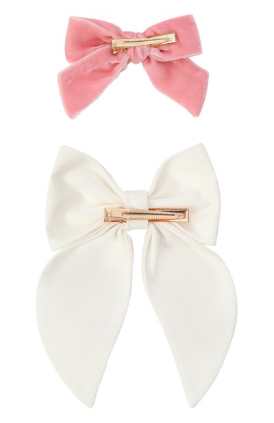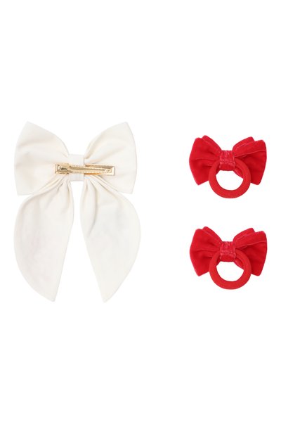В комплект включили три банта. Два небольших бархатных аксессуара с резинками оставили без декора, а крупное изделие с заколкой украсили вышивкой.
