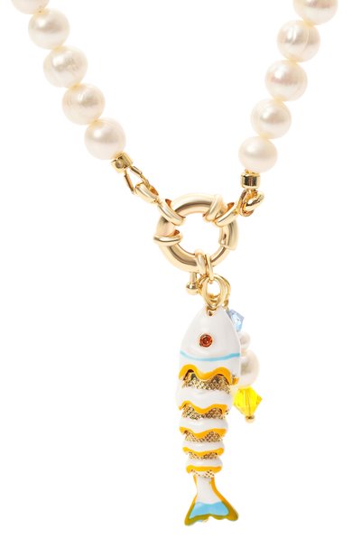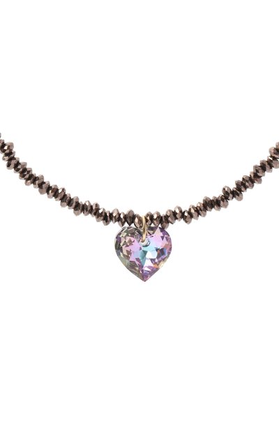 Колье-цепочку на двух карабинах выполнили из металла. Аксессуар украсили съемной кристальной подвеской и шармом в виде собачки из воздушного шара.