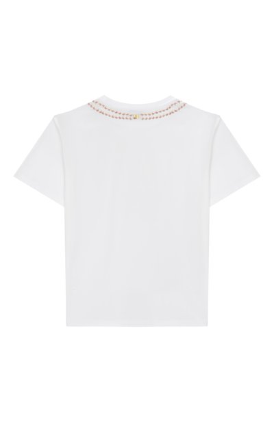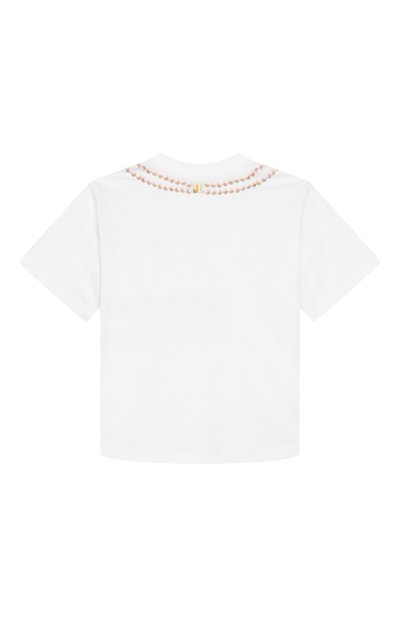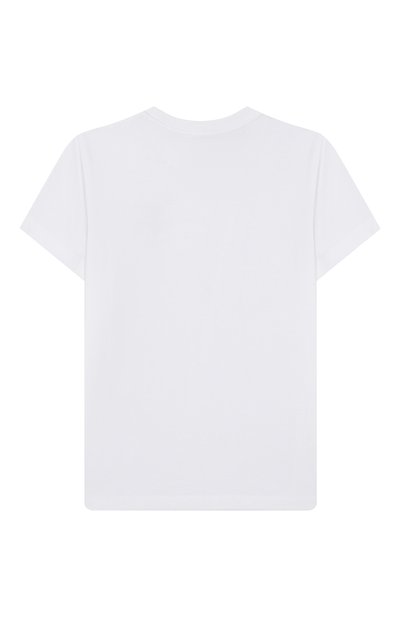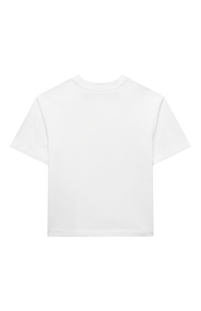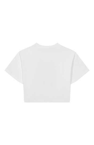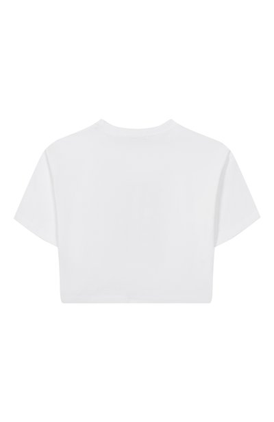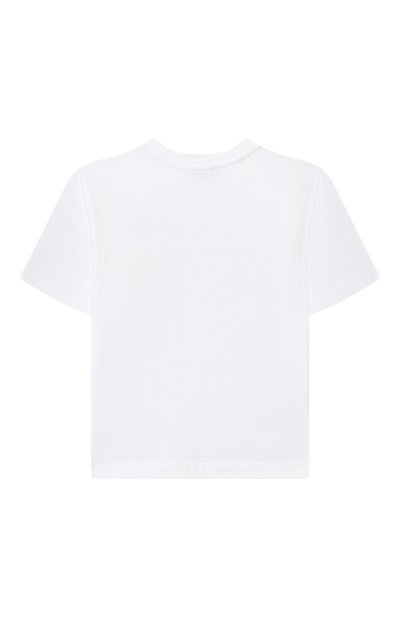 Футболку с неглубокой круглой горловиной в рубчик выполнили из органического хлопка. Спереди модель украсили изображением помады, которой словно написали логотип.