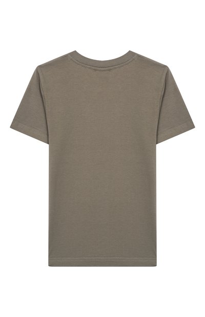 Свободную футболку выполнили из органического хлопка двух цветов, а горловину выделили рифленым кантом контрастного оттенка. Спереди на модели напечатали крупный логотип.
