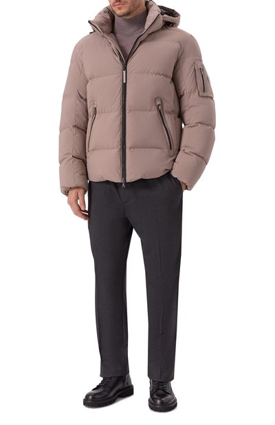 Стеганый пуховик Hugh-Dw с воротником-стойкой сшили из влагоотталкивающей полушерстяной ткани. Левый рукав украсили брендированным патчем. Сама куртка на утином пуху, как и два врезных кармана, застегивается молнией.