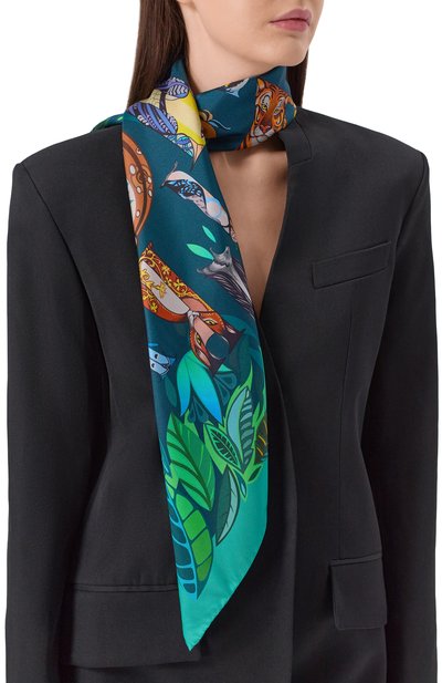Квадратный платок с цветочным принтом выполнили из шелкового твила. Края аксессуара с логотипом в углу подшили вручную в технике hand-rolled.
